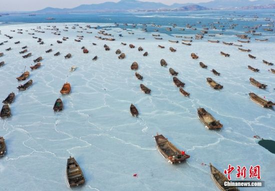 近日,受到寒潮低溫影響,大連金石灘海域海冰面積急速擴大,大量漁船被海冰凝固在金石灘漁港內,在潔白的冰面上排出一條條優美的曲線。