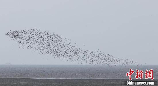4月9日,丹東東港市寶華路盡頭的鴨綠江入海口灘涂堤壩,隨著潮水不斷向岸邊翻涌,遠處的鳥群不斷起飛、落下、再起飛,形成一波一波的由水鳥構成的另一種浪潮,水鳥密集飛行時在空中形成各種隊形,令人嘆為觀止。圖為鴨綠江口“鳥浪”。