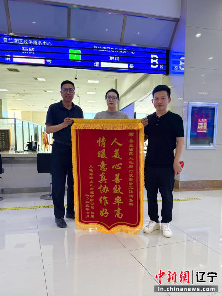 中新網遼寧新聞7月31日電 近日,大連海蠣文化傳媒有限公司負責人專程向普蘭店區人社局行政審批工傷核查科贈送錦旗,錦旗上“人美心善效率高,情暖意真協作好”十四個金字,連同企業在12345熱線的實名表揚,成為該局創新政務服務、優化營商環境的有力見證。